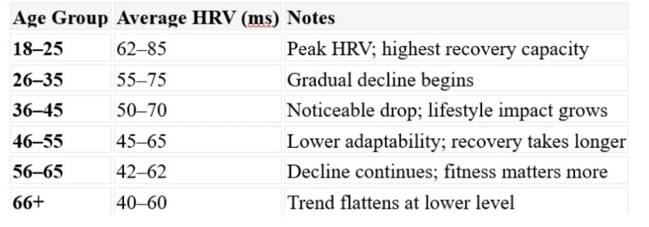 Here’s a summary table of average HRV ranges by age and fitness level: