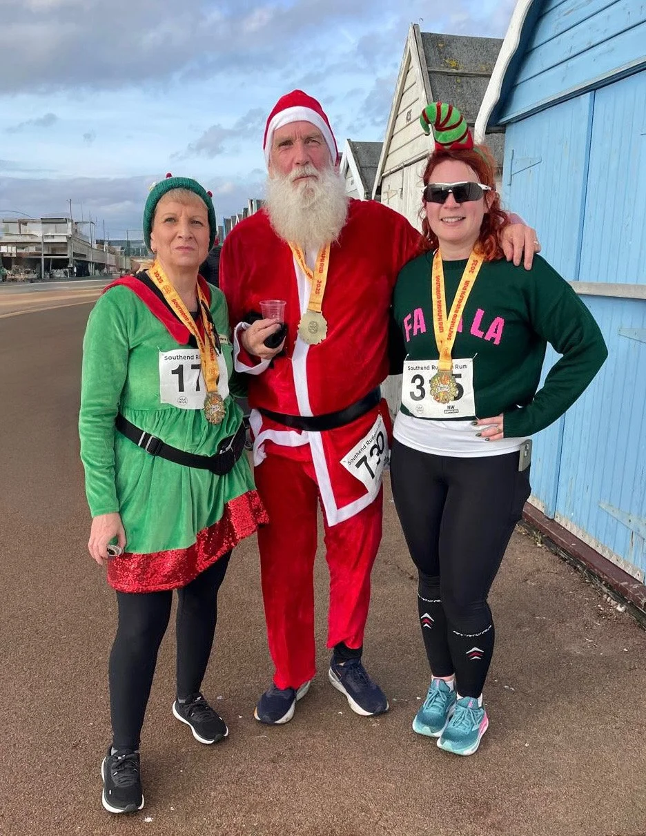 Several Barking Road Runners took part in the festive 5-mile Rudolph Run along the seafront at Shoebury and Southend on Sunday. First finisher was Martin Page 36:56 followed by Ron Vialls 40:35, Belinda Riches 45:40, Steve Colloff 51:18, Sian Mansley 53:37, Alison Fryatt 59:07, Dennis Spencer Perkins 1.00.26, Darren Graham 1:23:32 and Denise Graham 1:24:13.