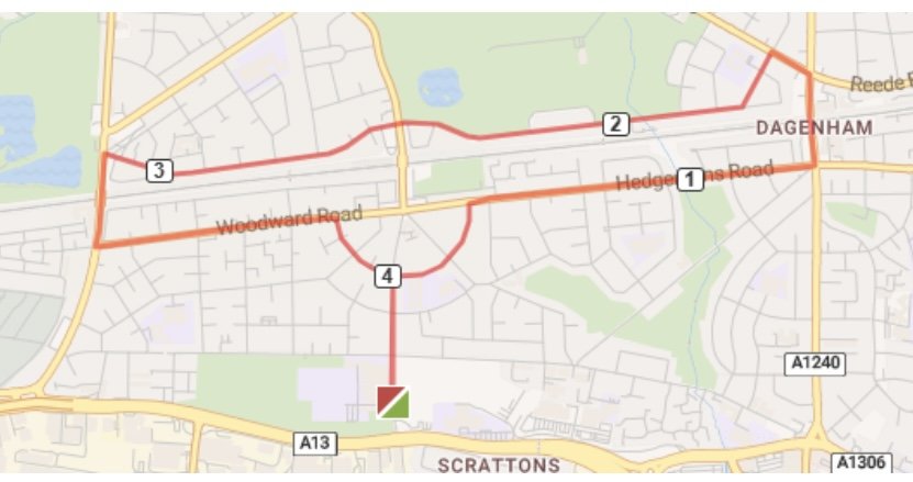 Left out of Castle Green along Gale St > Right Arden Cres > Right Hedgemans Rd > Left Heathway > Left Parsloes Avenue > Left Spurling Rd > Right Ivyhouse Rd > Across to Rugby Rd > Left Lodge Ave > Right Woodward Rd > Right Arden Cres > Right Gale St > back to Castle Green. And rest!