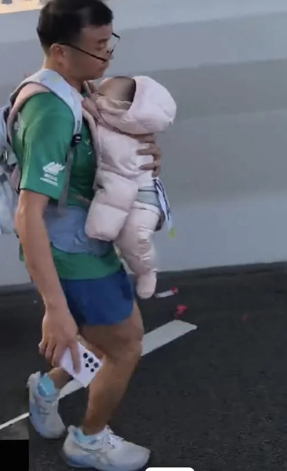 Video footage of the man running with his race bib pinned on the baby’s pink clothes during the race went viral on social media.