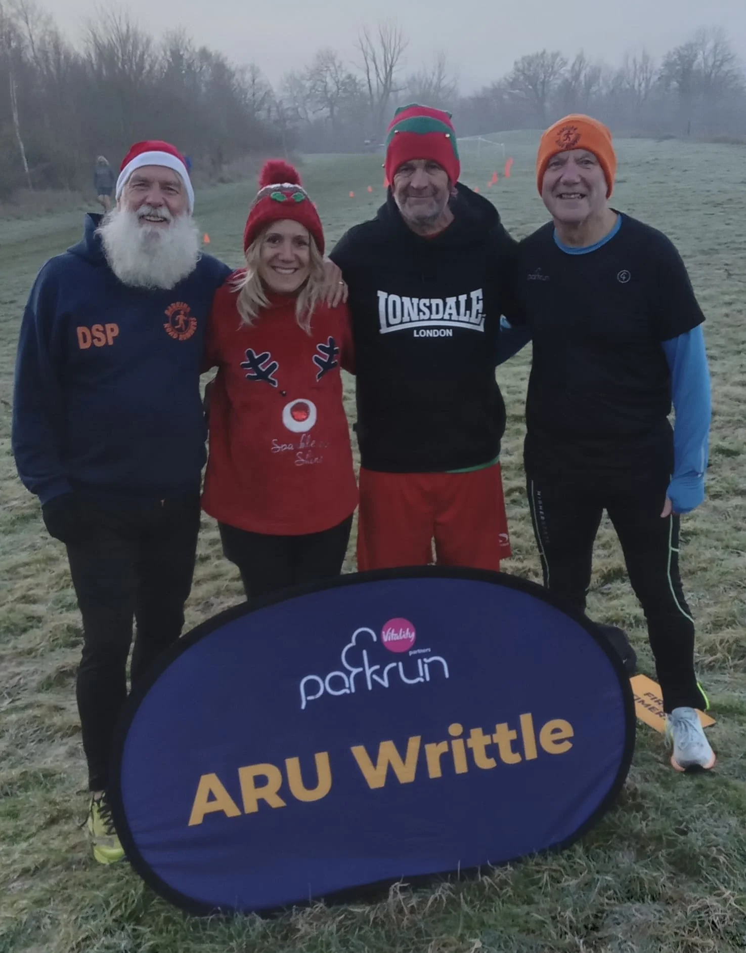 Dennis, Belinda, Steve, and Gary at frosty ARU Writtle parkrun