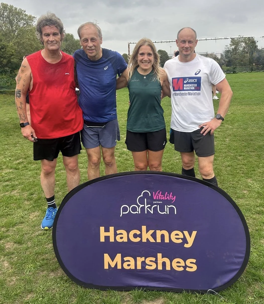 Steve C, Barry, Belinda, and Jason S at Hackney Marshes parkrun