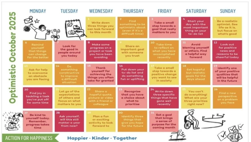 Wednesday marks the start of Optimistic October. I’m not sure I can be quite as optimistic as the table below requires, but I guess just taking forward a few of the suggestions will have a positive impact. Down with doom and gloom, up with optimism!