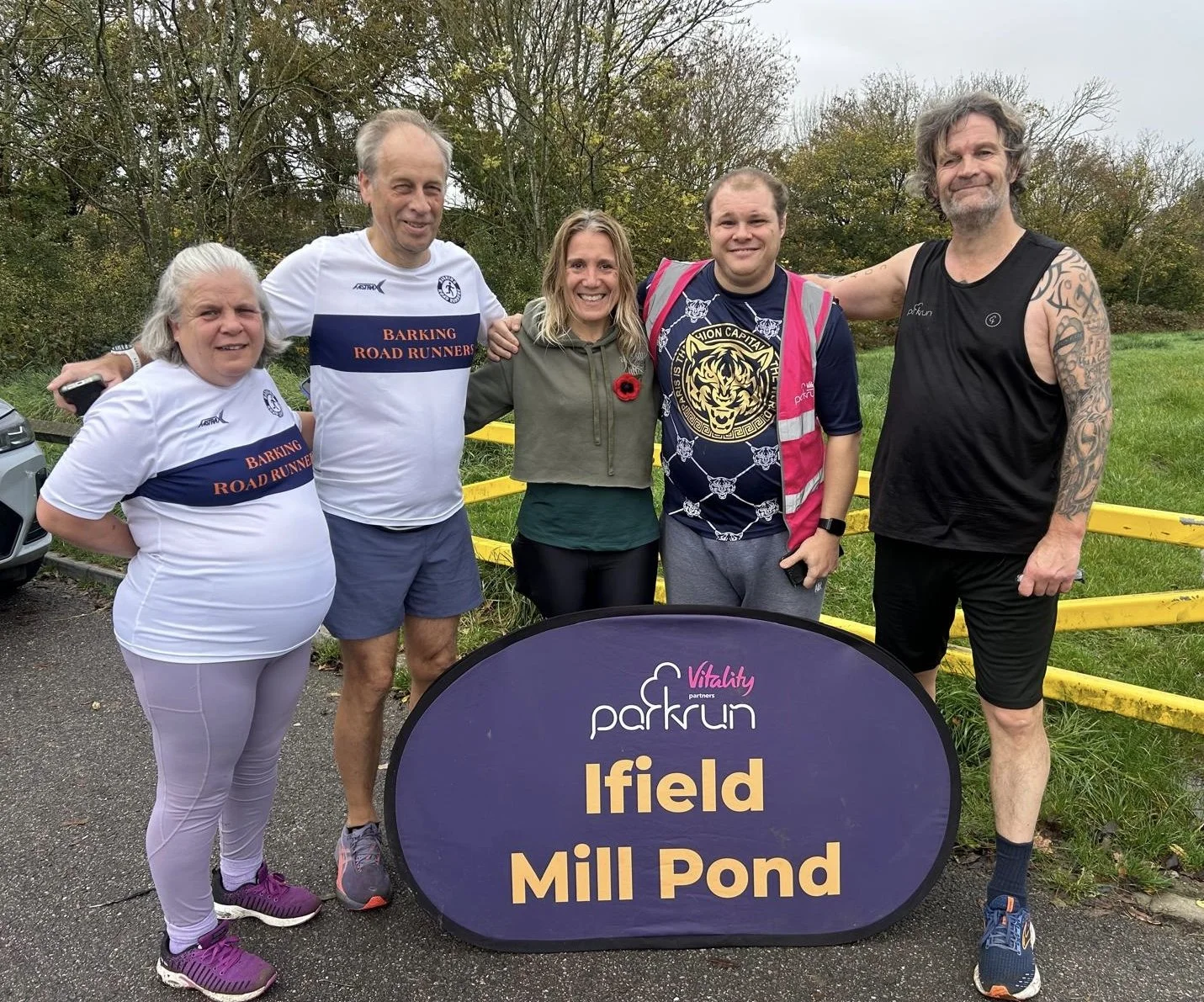Denise, Barry, Belinda, Darren (volunteering) and Steve at Ilfield Mill Pond parkrun